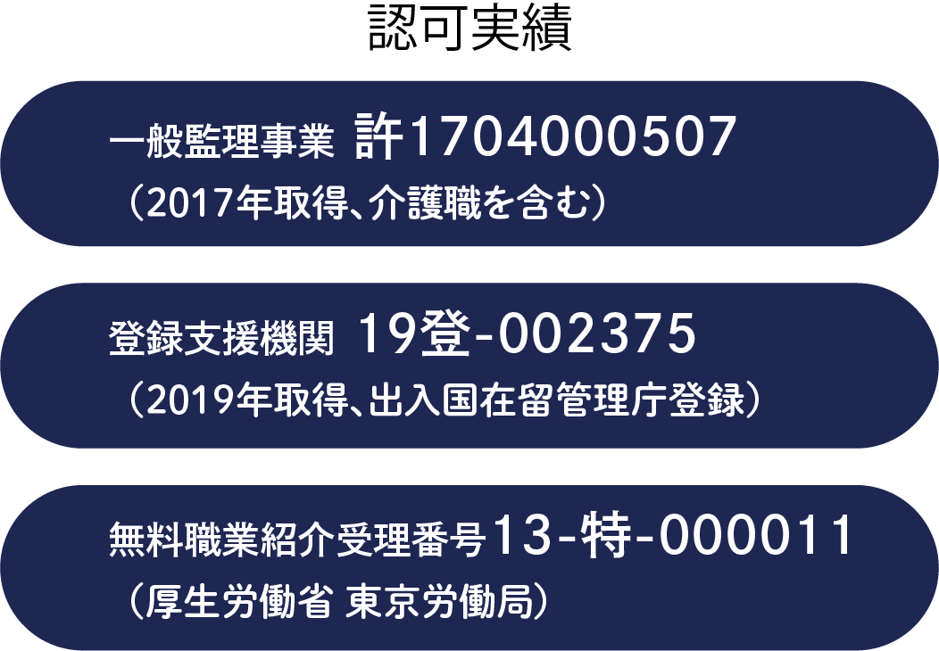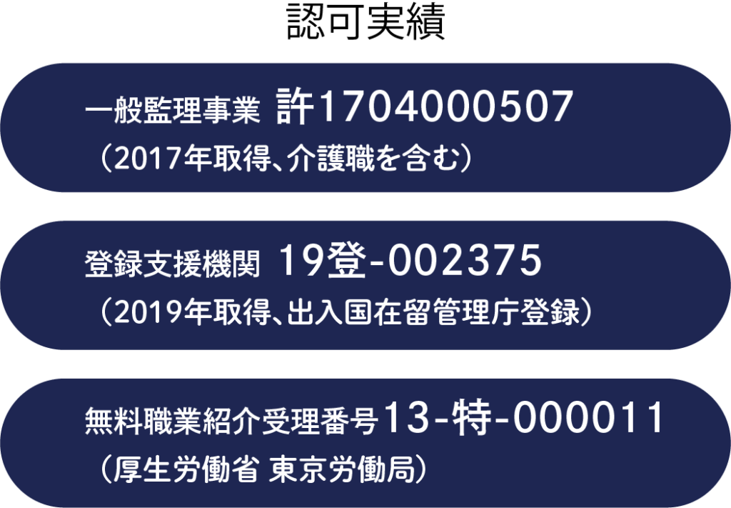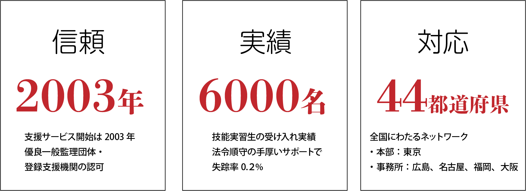 設立以来、当組合は出入国在留管理局の認可を受けた一般監理事業者として、常に法令を遵守し、透明性の高い事業運営を行ってまいりました。採用にあたっては、専門性や実務能力を備えた外国人人材を厳選し、長期的に活躍できる環境づくりにも力を入れ、価値観が多様化し、社会の変化が加速する現代においても、状況に応じて丁寧かつ迅速に対応しております。これからも、皆さまの事業を支えるパートナーとして、安心してお任せいただけるサービス提供を追求してまいります。