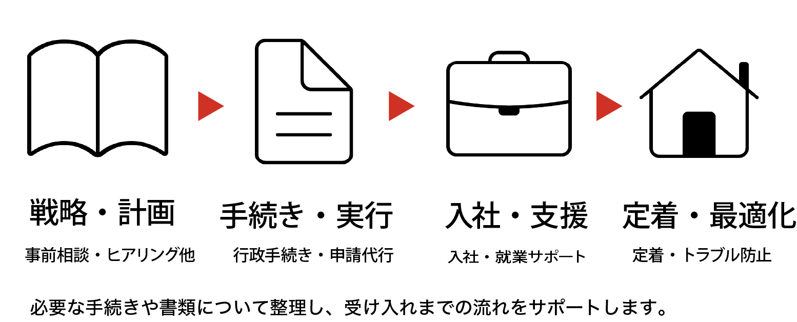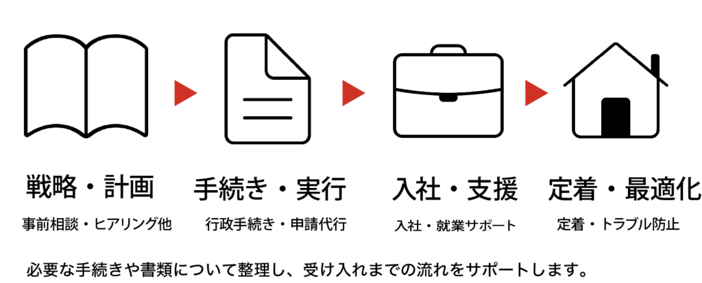 採用前の整理から、受入後のフォローまで、各段階に応じた支援を行っています。